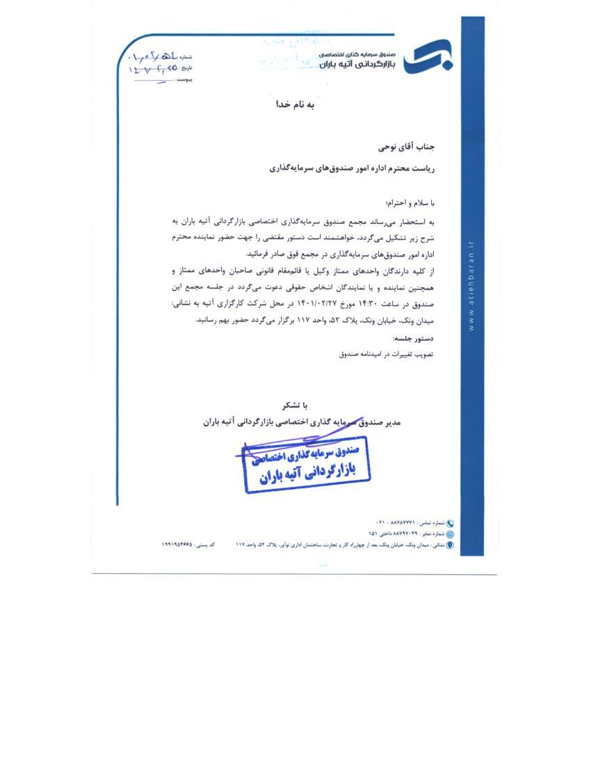 آگهی دعوت به مجمع مورخ 1401/02/27صندوق سرمايه گذاري اختصاصي بازارگرداني آتیه باران در خصوص تغییرات امیدنامه